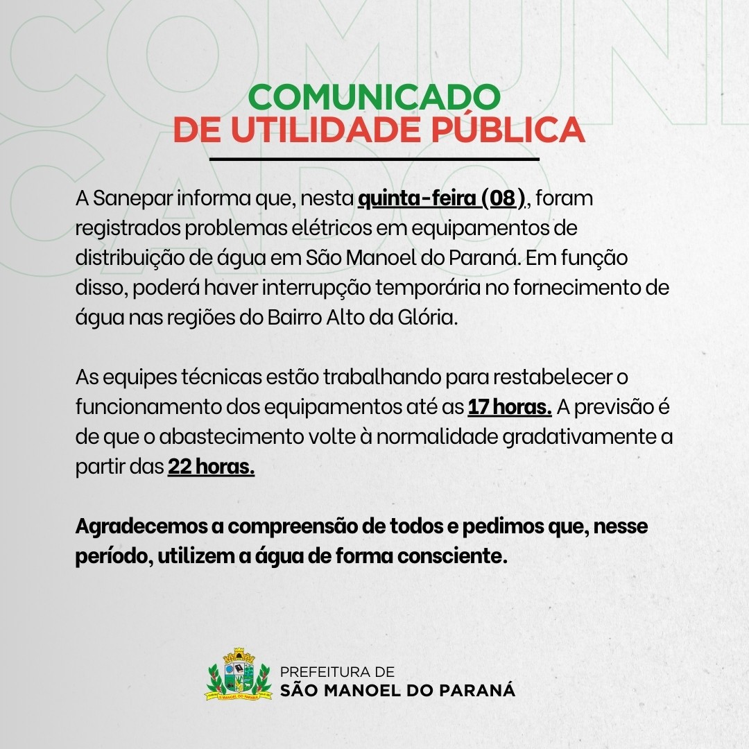A Sanepar informa que, nesta quinta-feira (08), ocorreram problemas elétricos em equipamentos de distribuição de água em São Manoel do Paraná. Como resultado, pode haver interrupção temporária no fornecimento de água nas regiões do Bairro Alto da Glória.