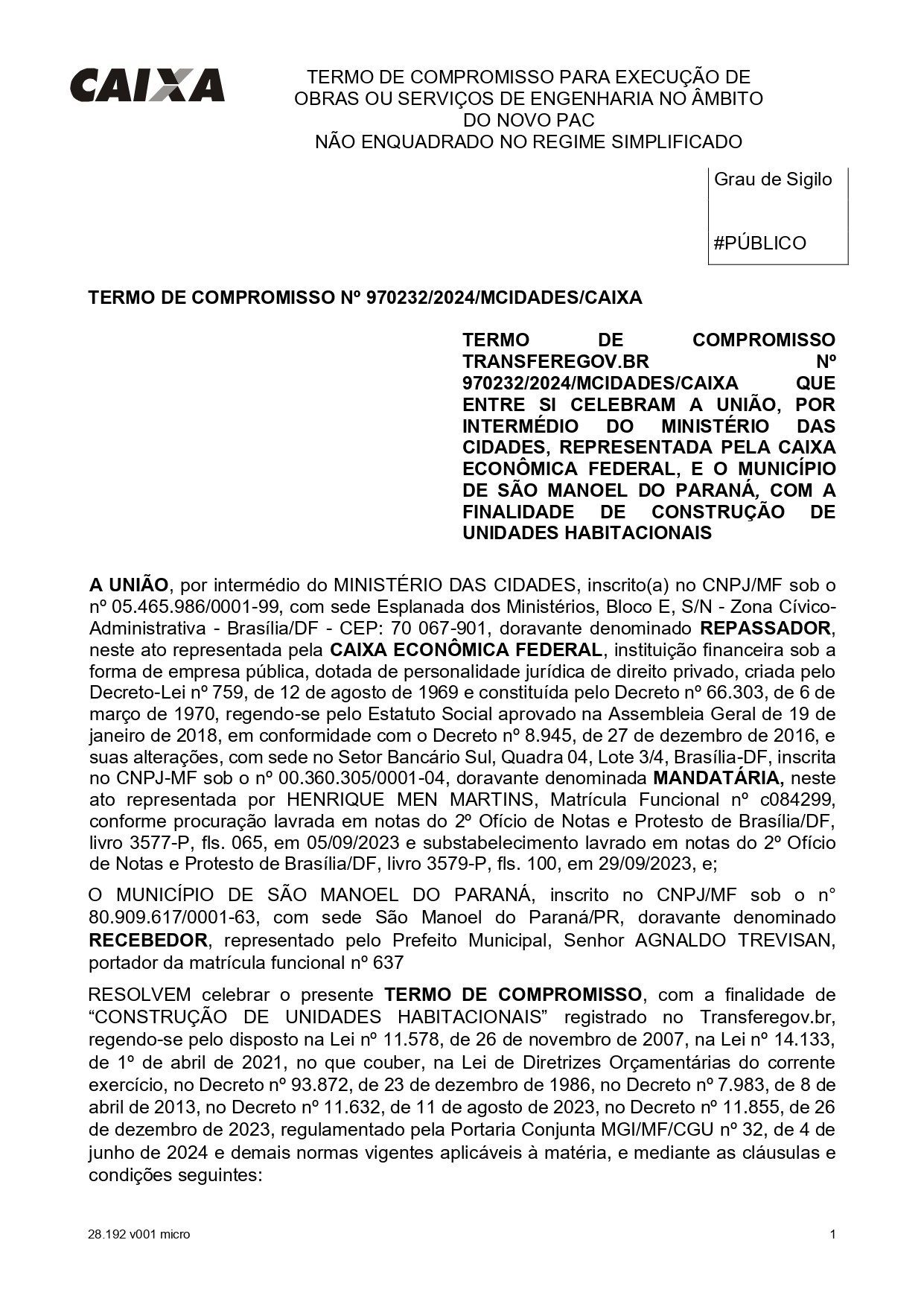 O município de São Manoel do Paraná deu mais um passo importante em sua trajetória de desenvolvimento e cuidado com a população. No dia 13 de dezembro de 2024, o prefeito Agnaldo Trevisan assinou o Termo de Compromisso que garantirá o repasse de R$ 3.250.000,00 do Governo Federal, por meio do Programa Moradia Digna, para a construção de 25 novas moradias destinadas a famílias de baixa renda.