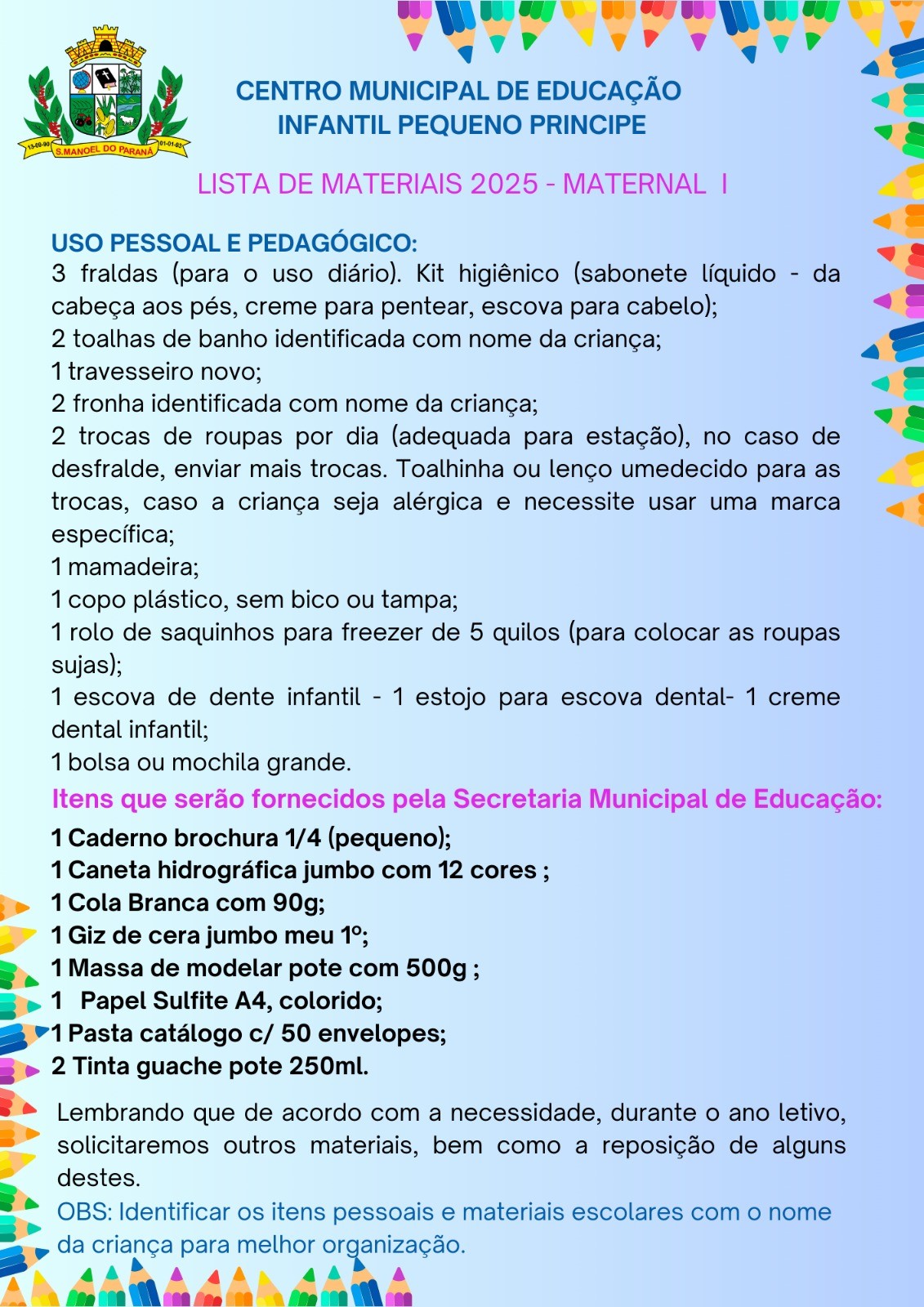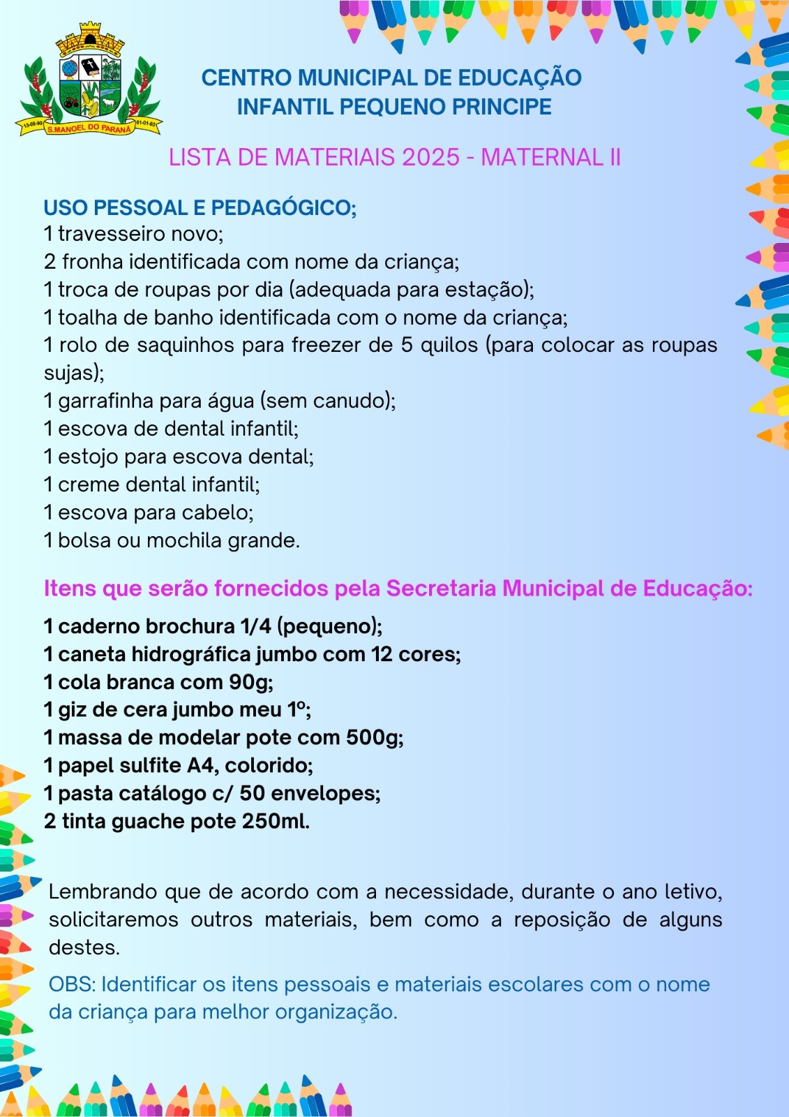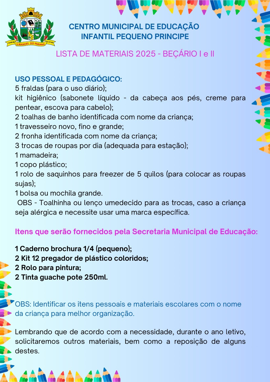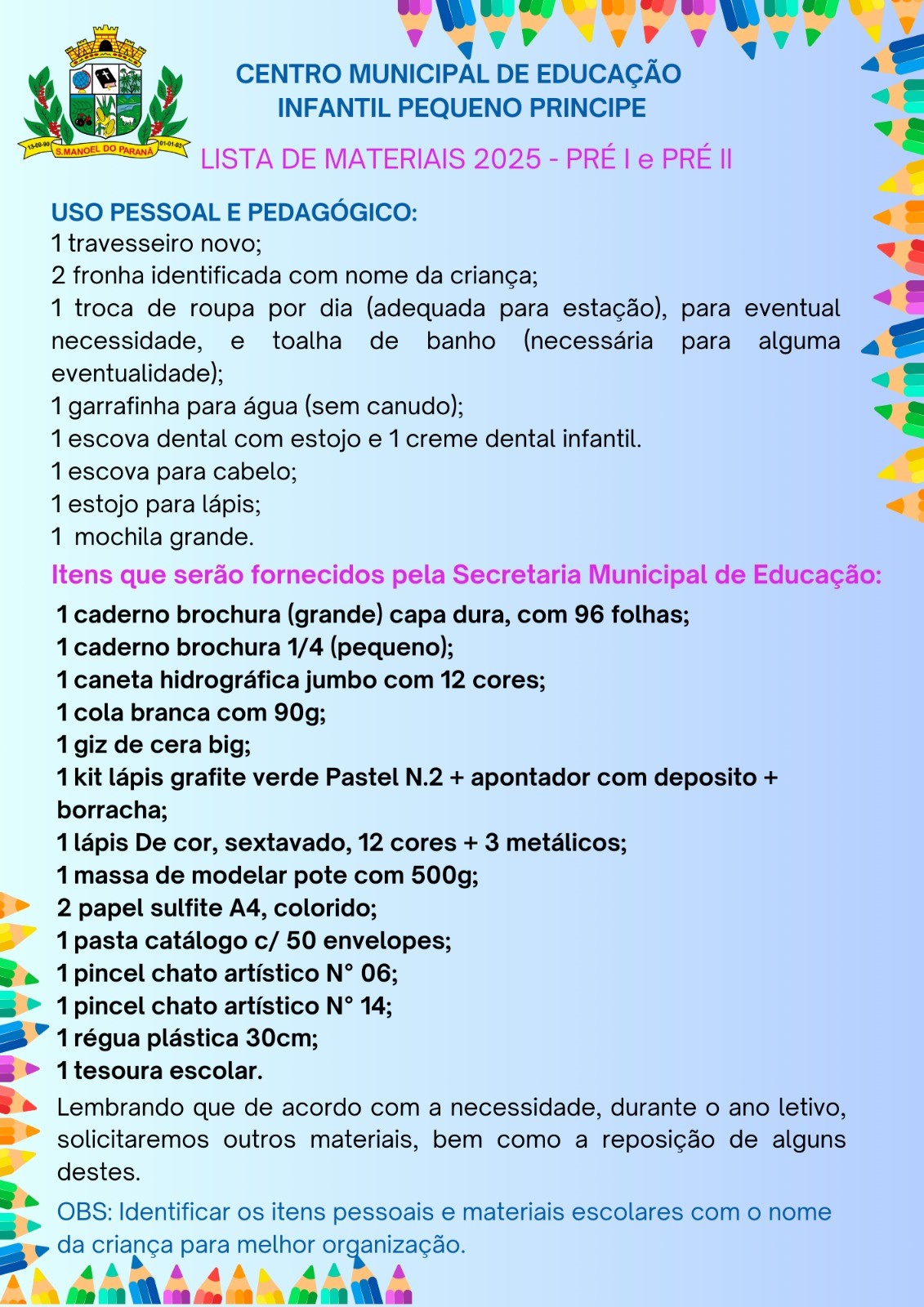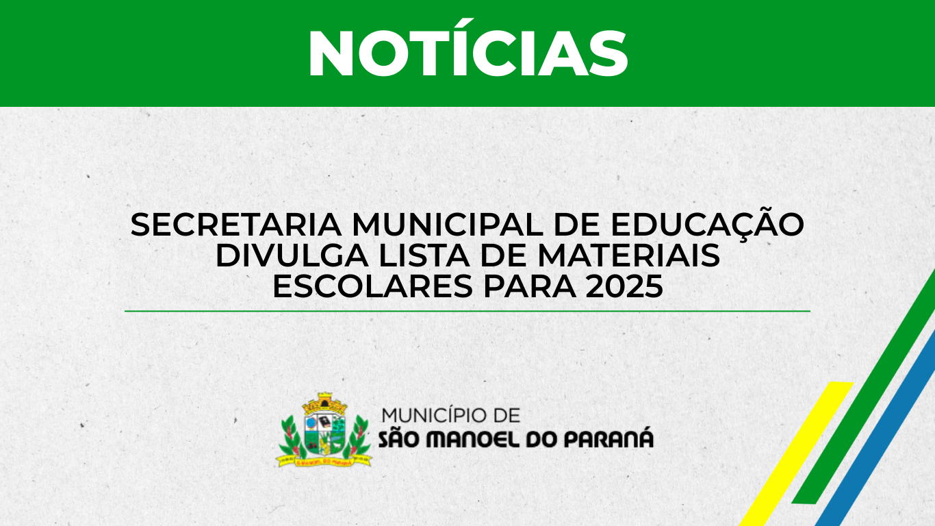 A Secretaria Municipal de Educação de São Manoel do Paraná informa que a lista de materiais escolares da Rede Municipal de Ensino para o ano letivo de 2025 já está disponível.