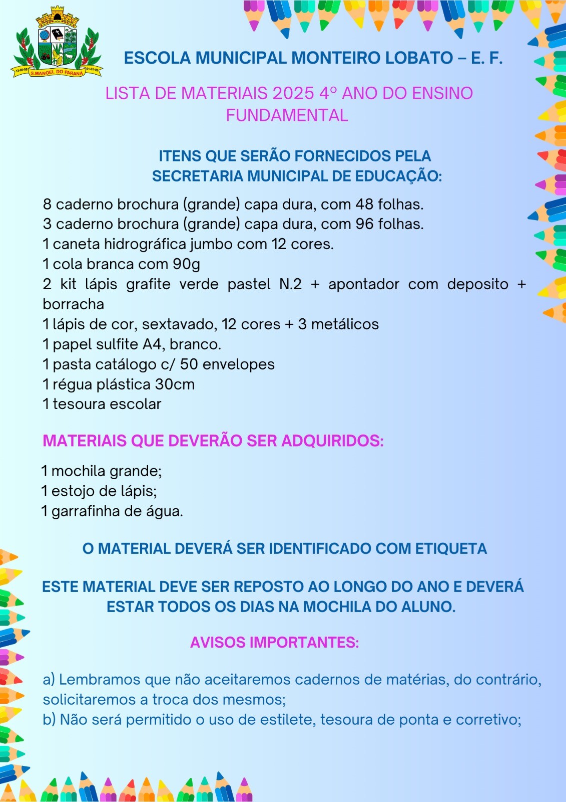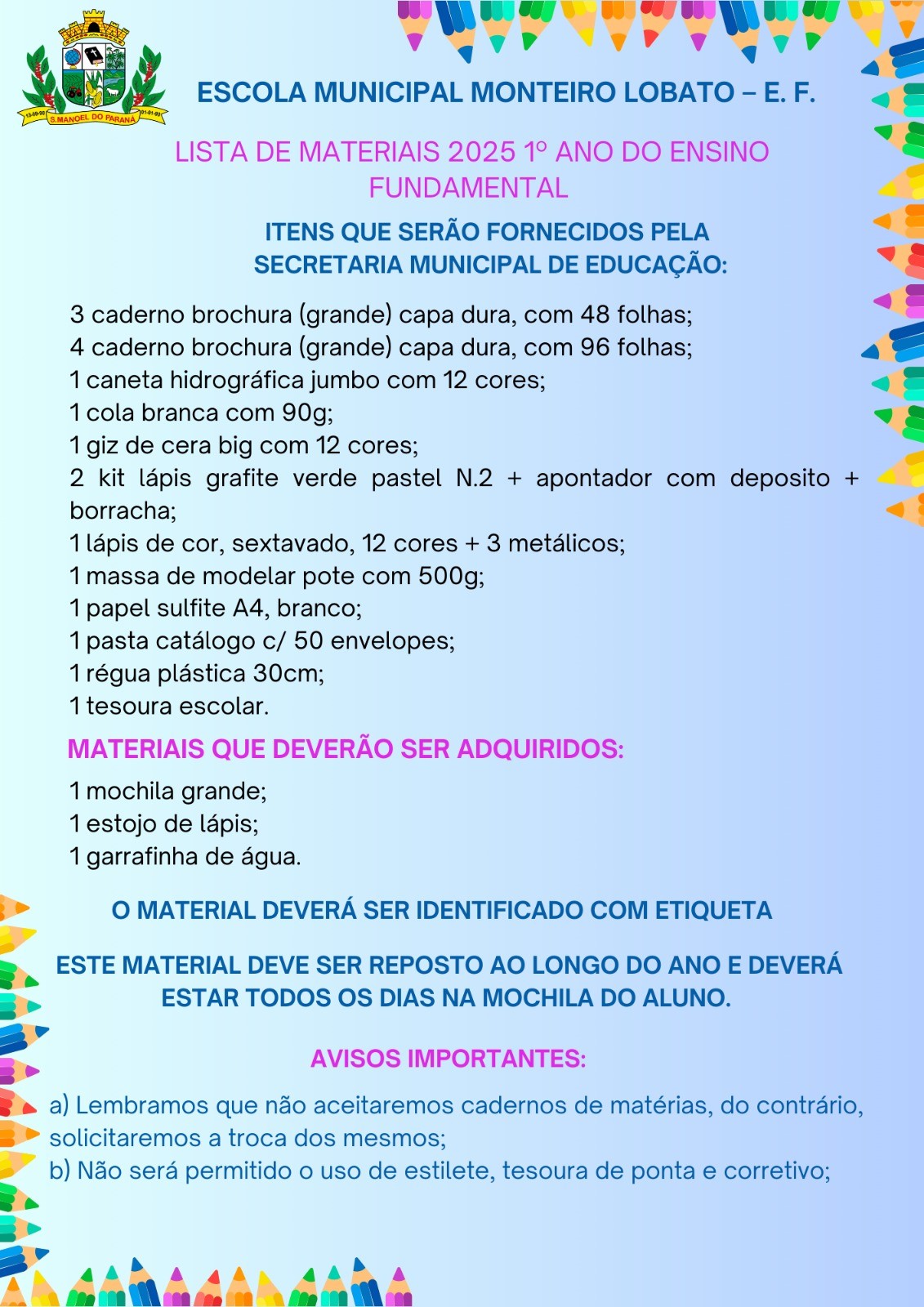 As aulas terão início no dia 05 de fevereiro de 2025, e os pais ou responsáveis devem estar atentos à lista, que contém os materiais necessários para o desenvolvimento escolar dos alunos.