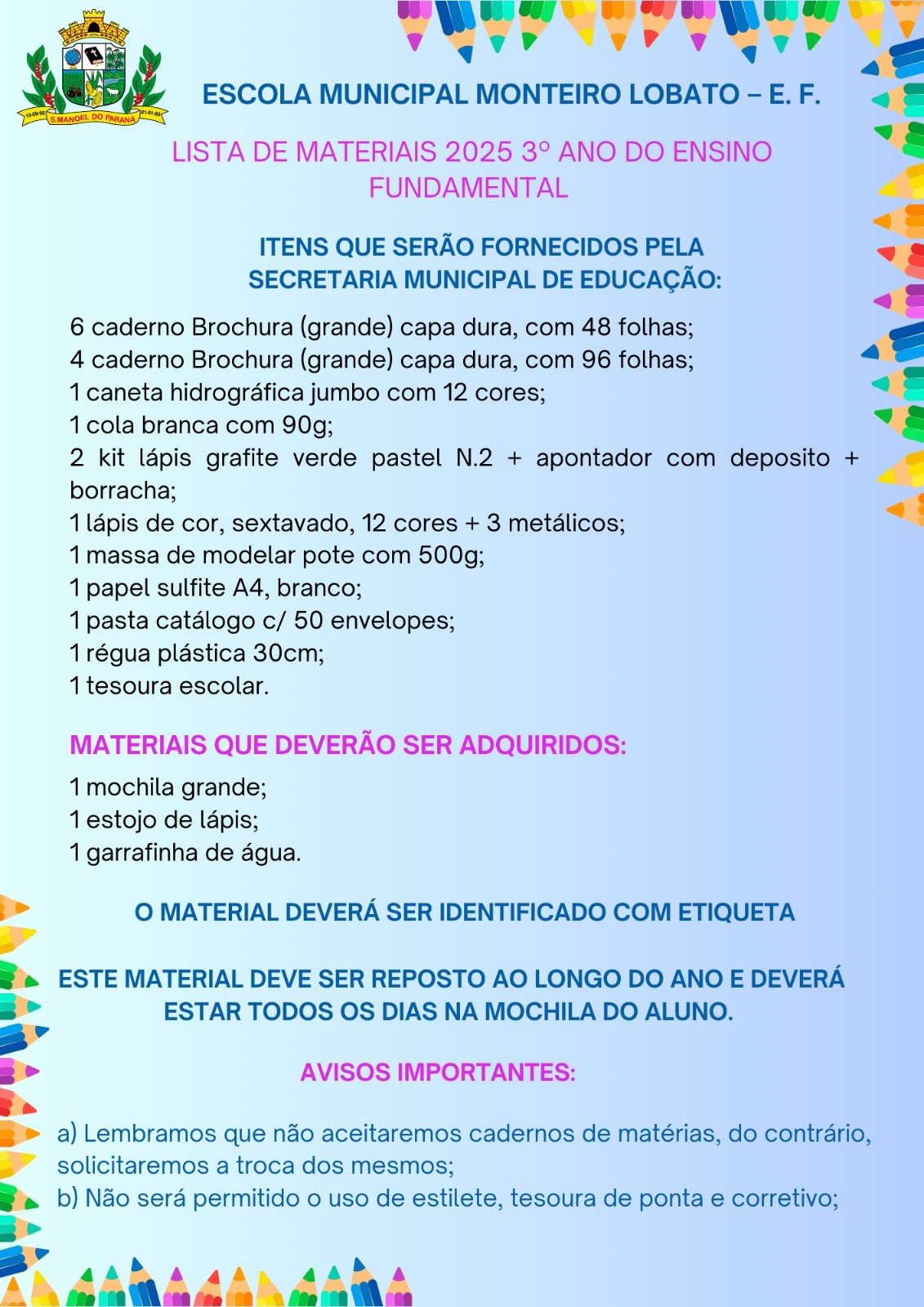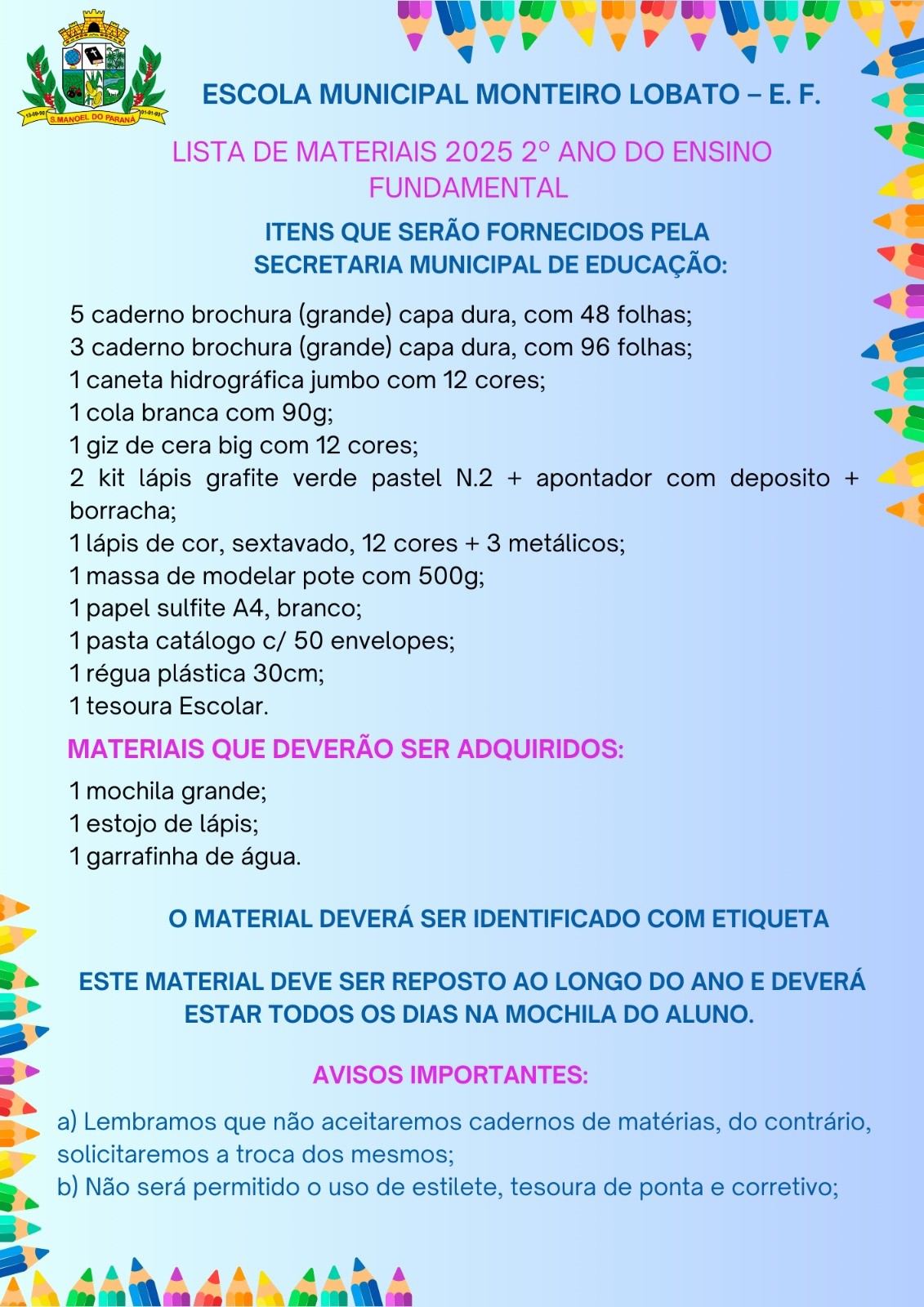 Os materiais escolares listados incluem os itens que serão oferecidos pela Administração Municipal, por meio da Secretaria de Educação, reafirmando o compromisso de garantir o acesso igualitário à educação de qualidade para todos os estudantes da rede municipal.