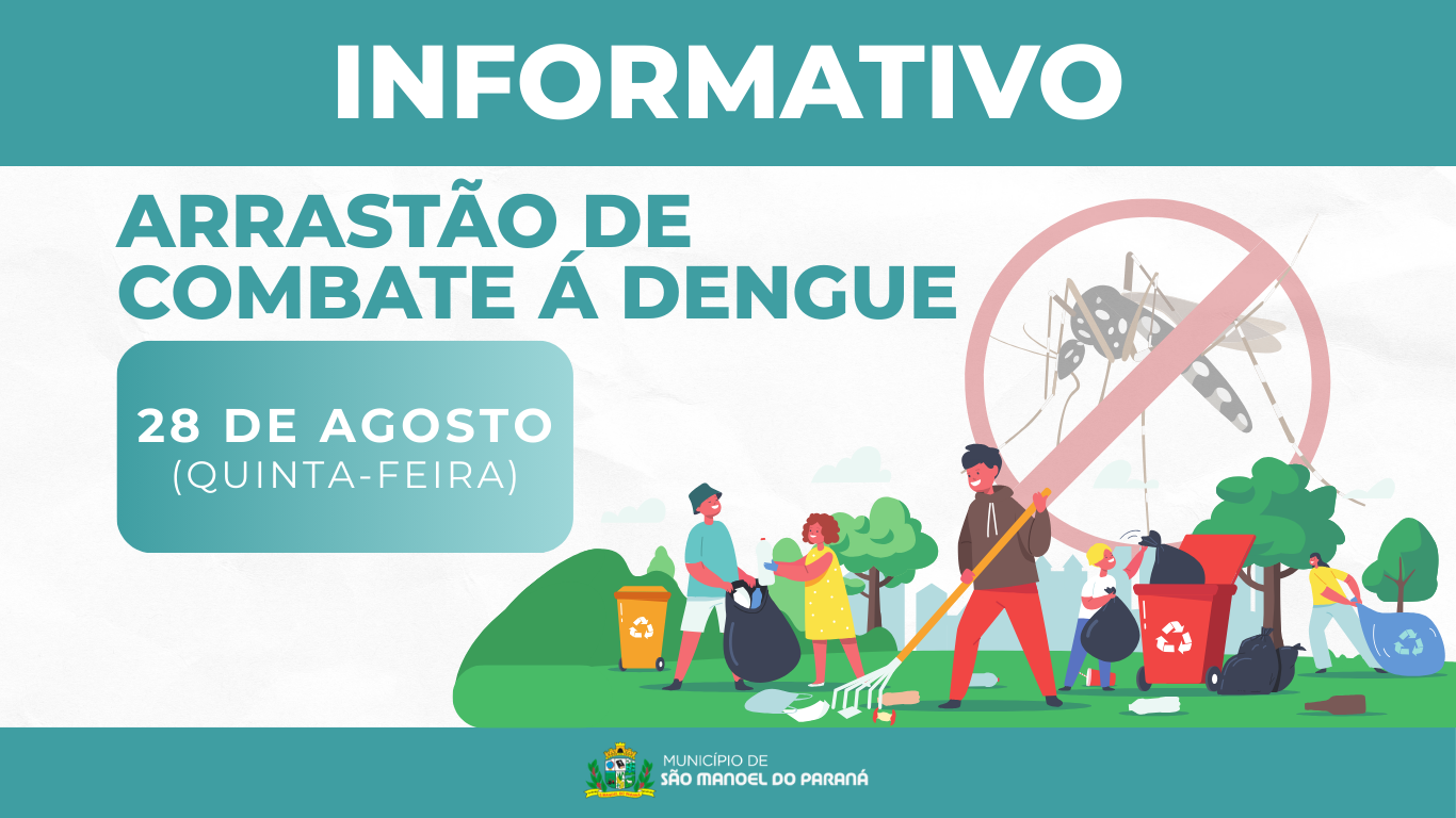 Na quinta-feira, 28 de agosto, das 7h às 17h, a Secretaria Municipal de Saúde de São Manoel do Paraná realizará o Arrastão de Combate à Dengue, com o recolhimento de resíduos em todas as residências do município.