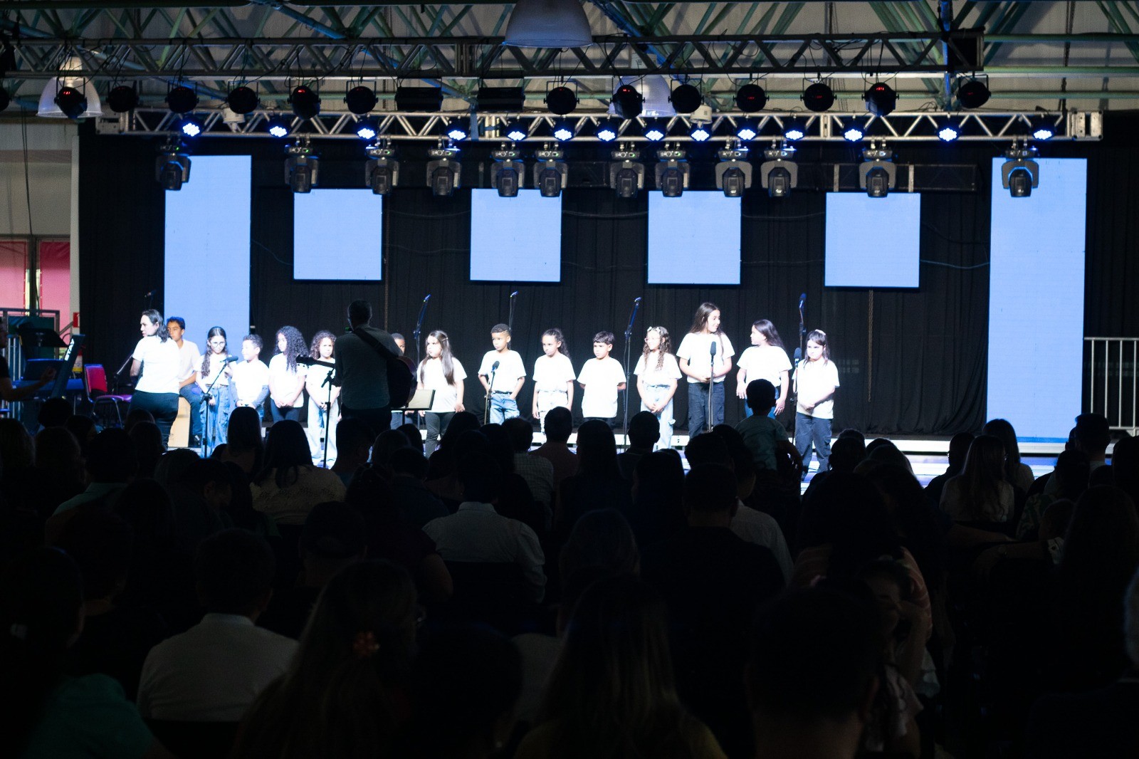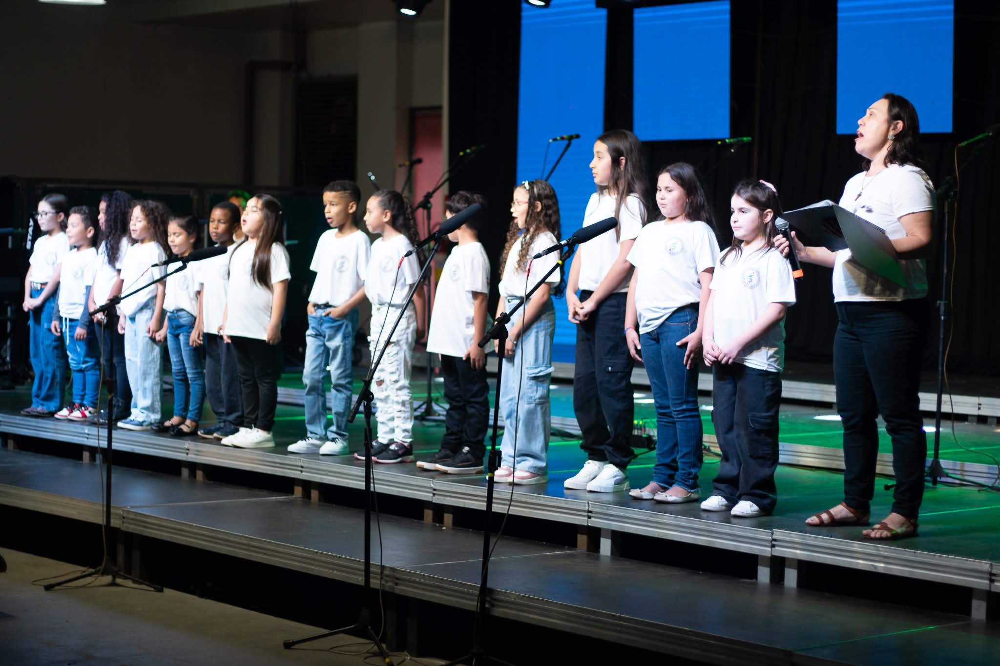 A apresentação foi conduzida pelos instrutores Rogério e Rosângela, responsáveis pelas oficinas musicais, e contou com um repertório emocionante. No palco, as crianças interpretaram as canções “Aquarela”, “De gotinha em gotinha”, “Bênçãos que não têm fim” e “Era uma vez”.