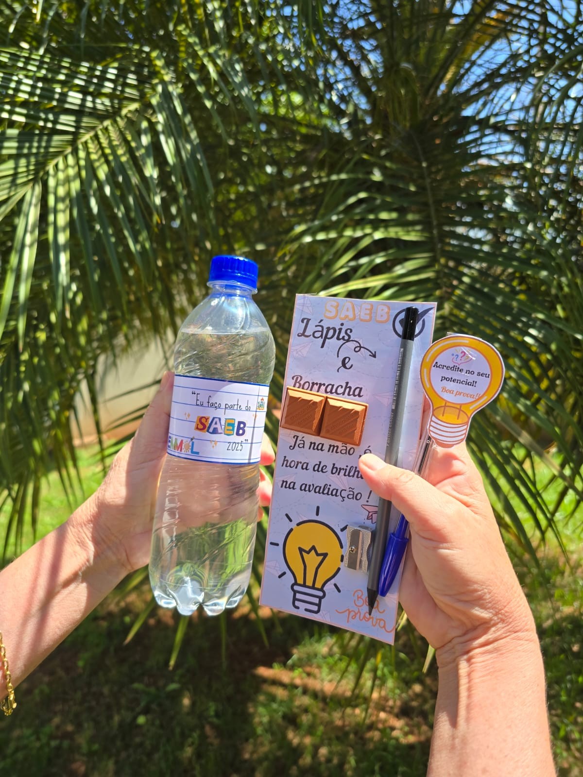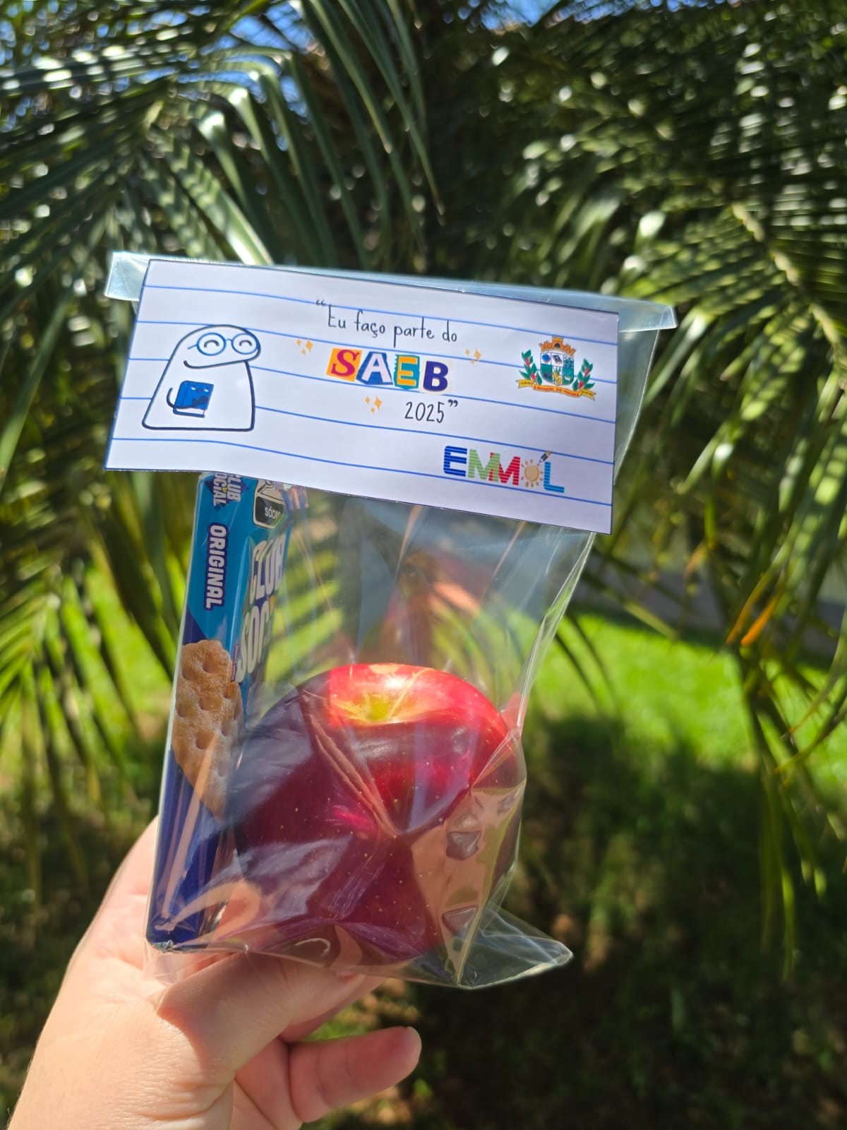 Nas salas de aula, cada aluno encontrou dois kits preparados com carinho: um com bolacha e maçã para um lanche rápido e outro com lápis, caneta, borracha e apontador, acompanhados de mensagens de incentivo para tornar o momento ainda mais acolhedor.