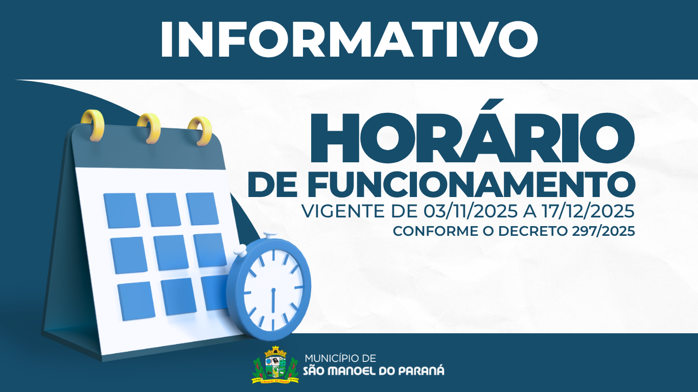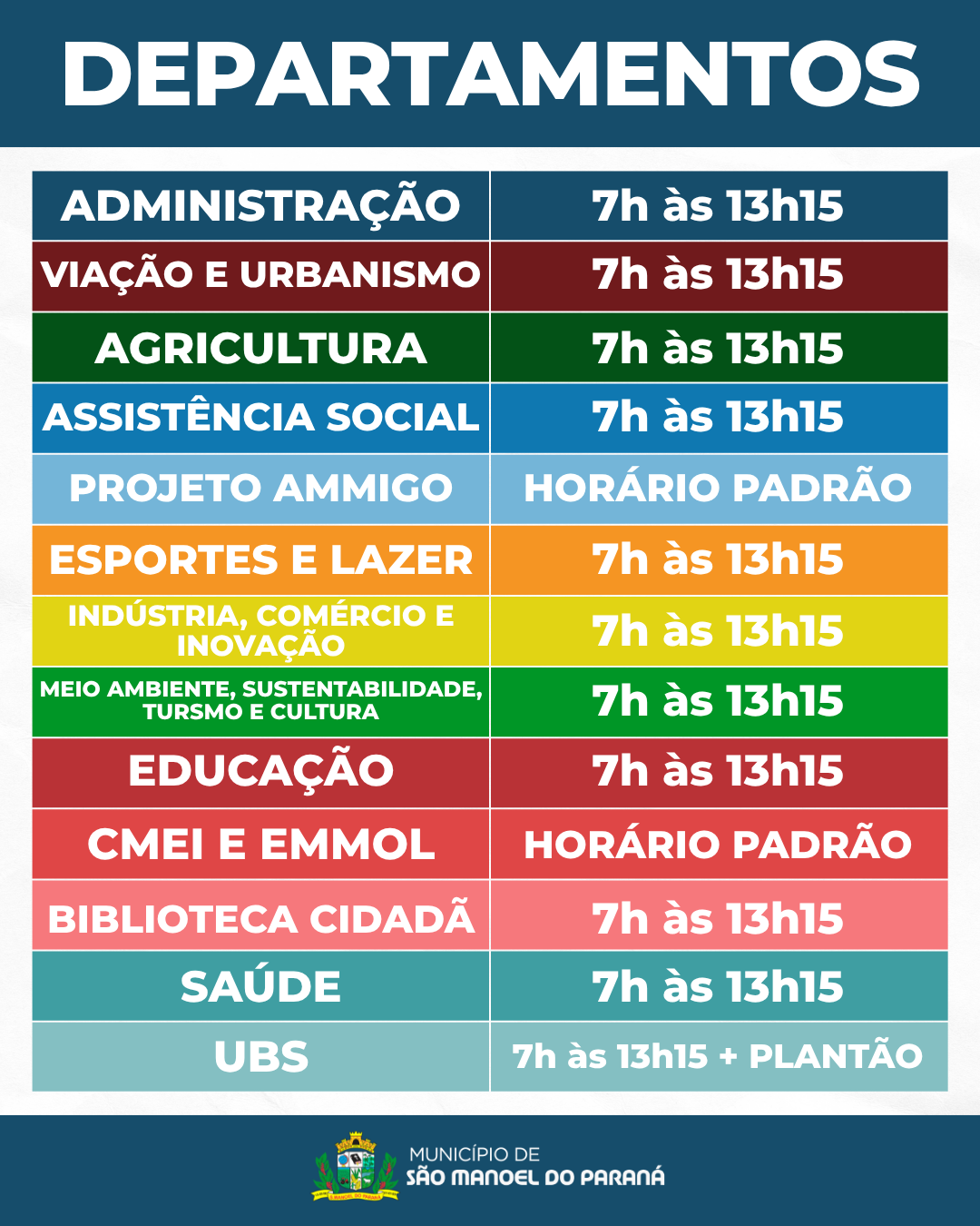 A Administração Municipal de São Manoel do Paraná/PR vem, por meio desta publicação, informar toda comunidade são-manoelense sobre os novos horários de funcionamento dos órgãos públicos municipais.