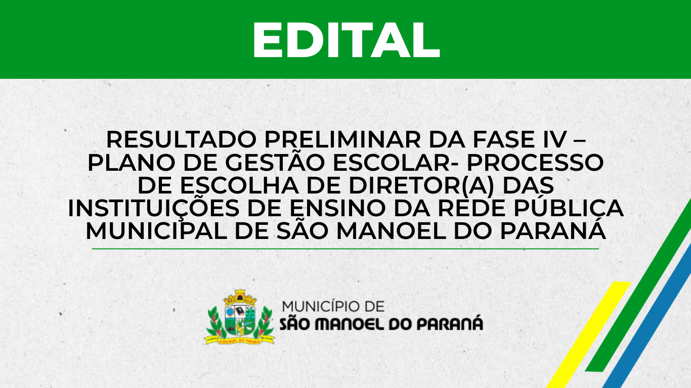 A Prefeitura Municipal de São Manoel do Paraná, por meio da Secretaria Municipal de Educação, torna público o presente Edital, que divulga o Resultado Preliminar da Fase IV – Plano de Gestão Escolar, etapa integrante do Processo de Escolha de Diretor(a) das Instituições de Ensino da Rede Pública Municipal. Esta fase compõe o conjunto de procedimentos previstos na Lei Municipal nº 019/2025 e no Edital nº 01/2025, que regulamentam o processo seletivo fundamentado em critérios de mérito, desempenho e competência técnico-administrativa.