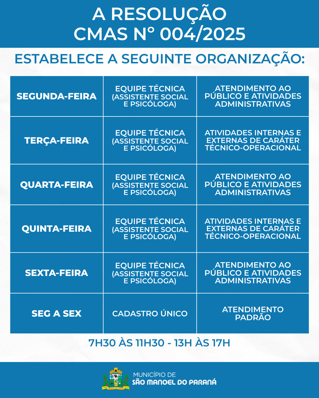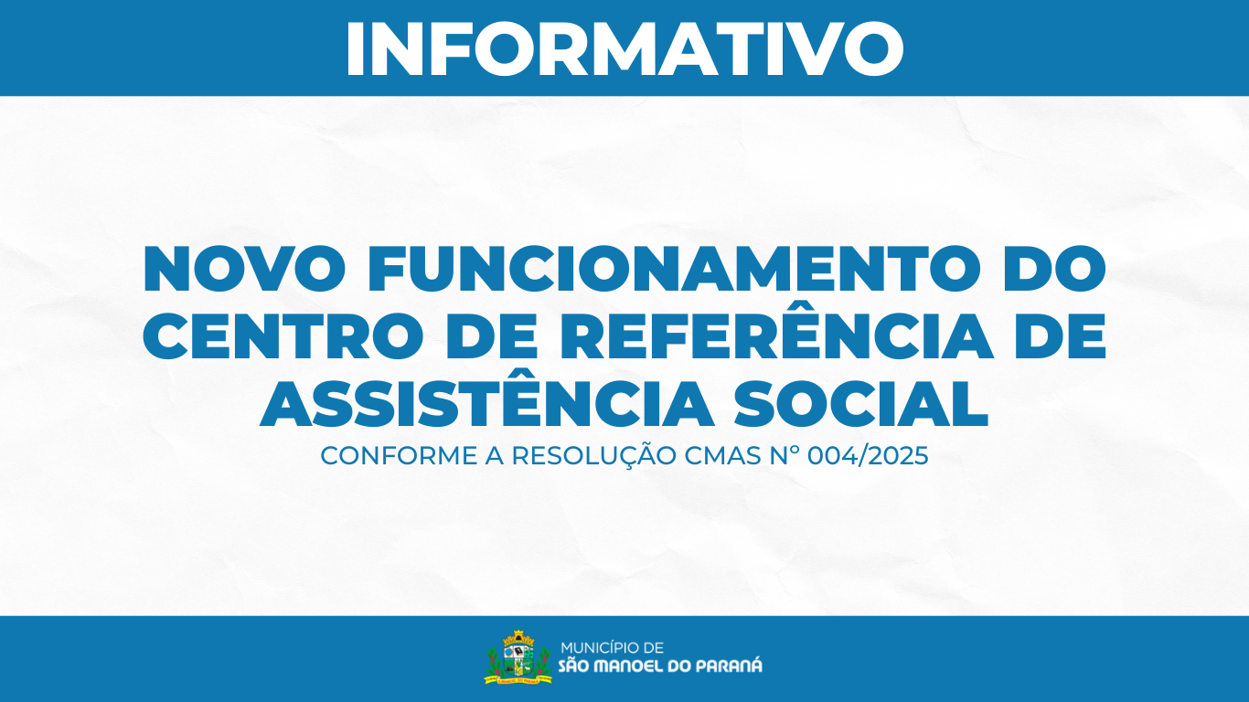 A Secretaria Municipal de Assistência Social de São Manoel do Paraná/PR informa que, a partir do dia 05 de janeiro, o Centro de Referência de Assistência Social passa a funcionar conforme a Resolução CMAS nº 004/2025.