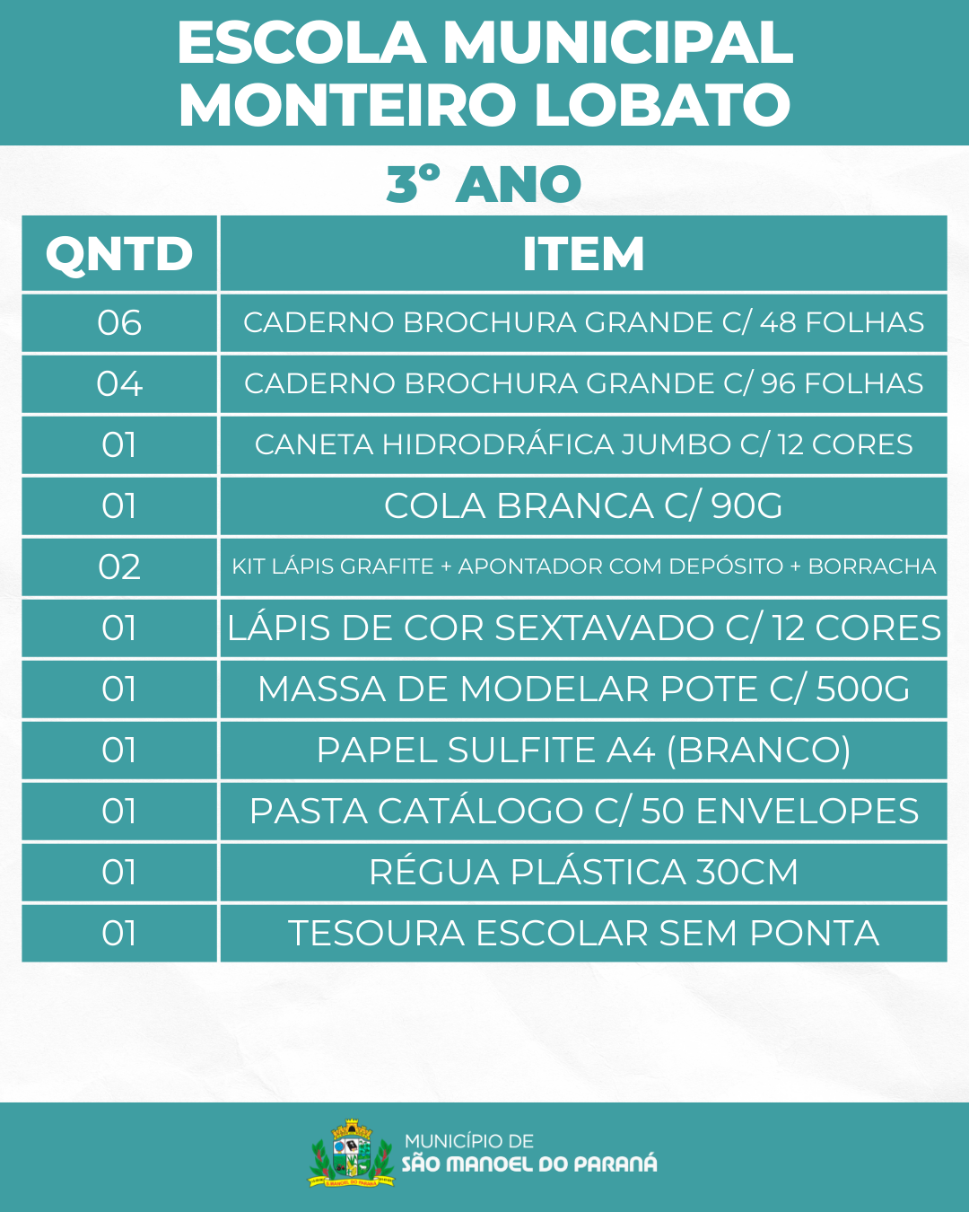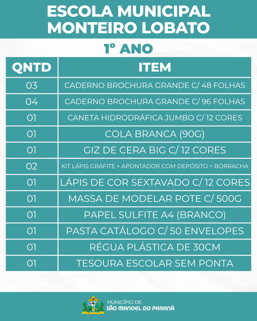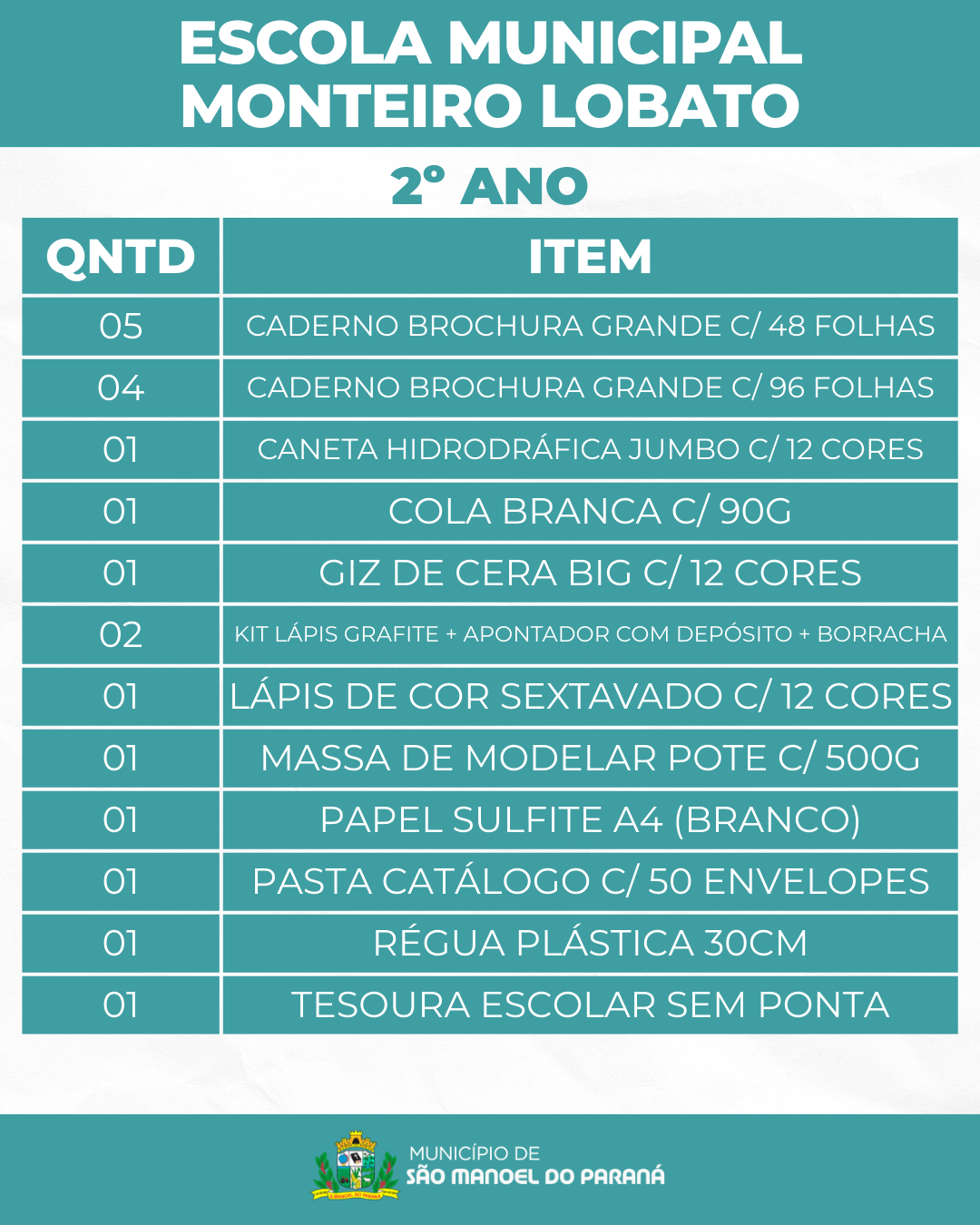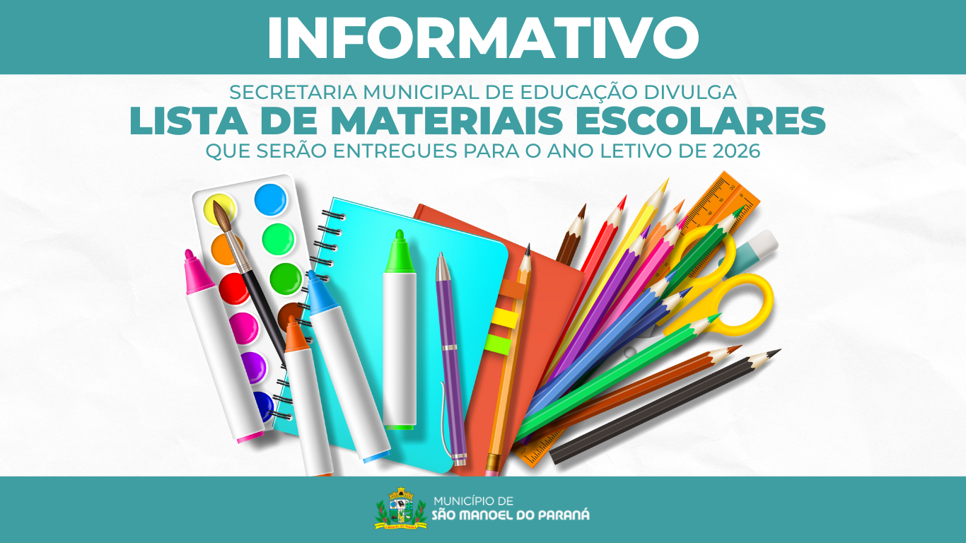 A Secretaria Municipal de Educação de São Manoel do Paraná/PR apresenta a lista de materiais escolares que serão distribuídos gratuitamente aos estudantes da rede municipal de ensino no ano letivo de 2026.