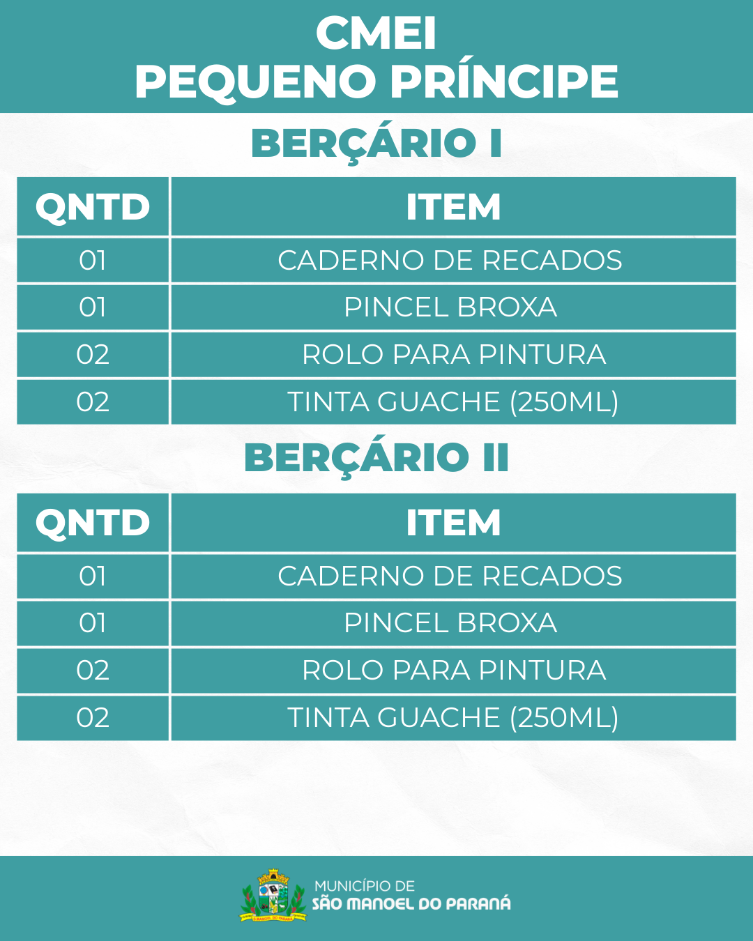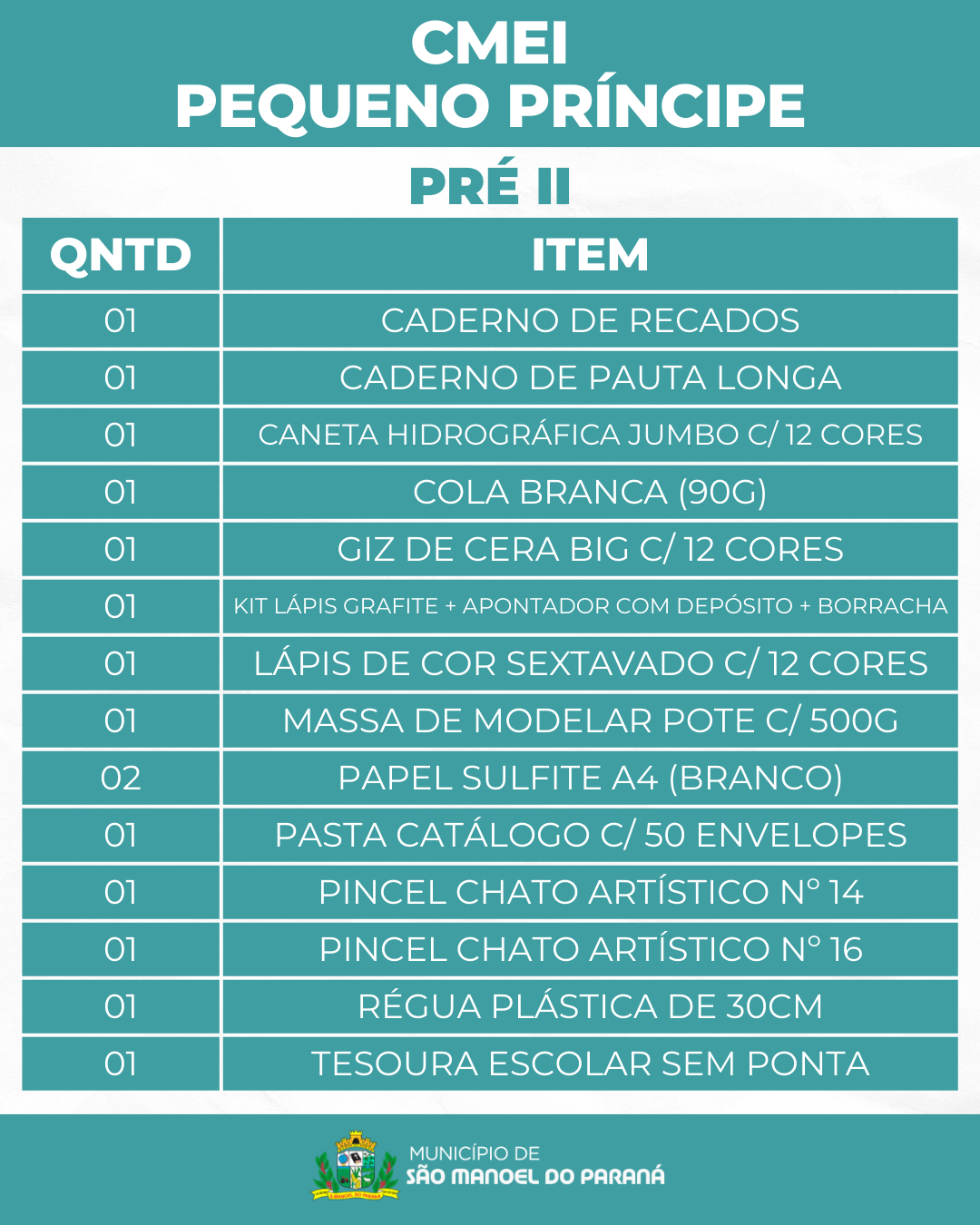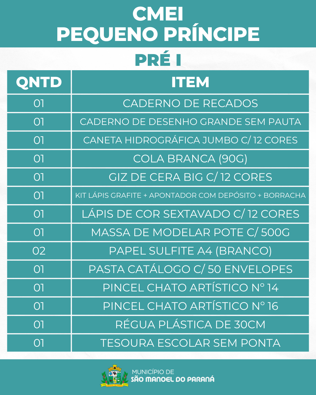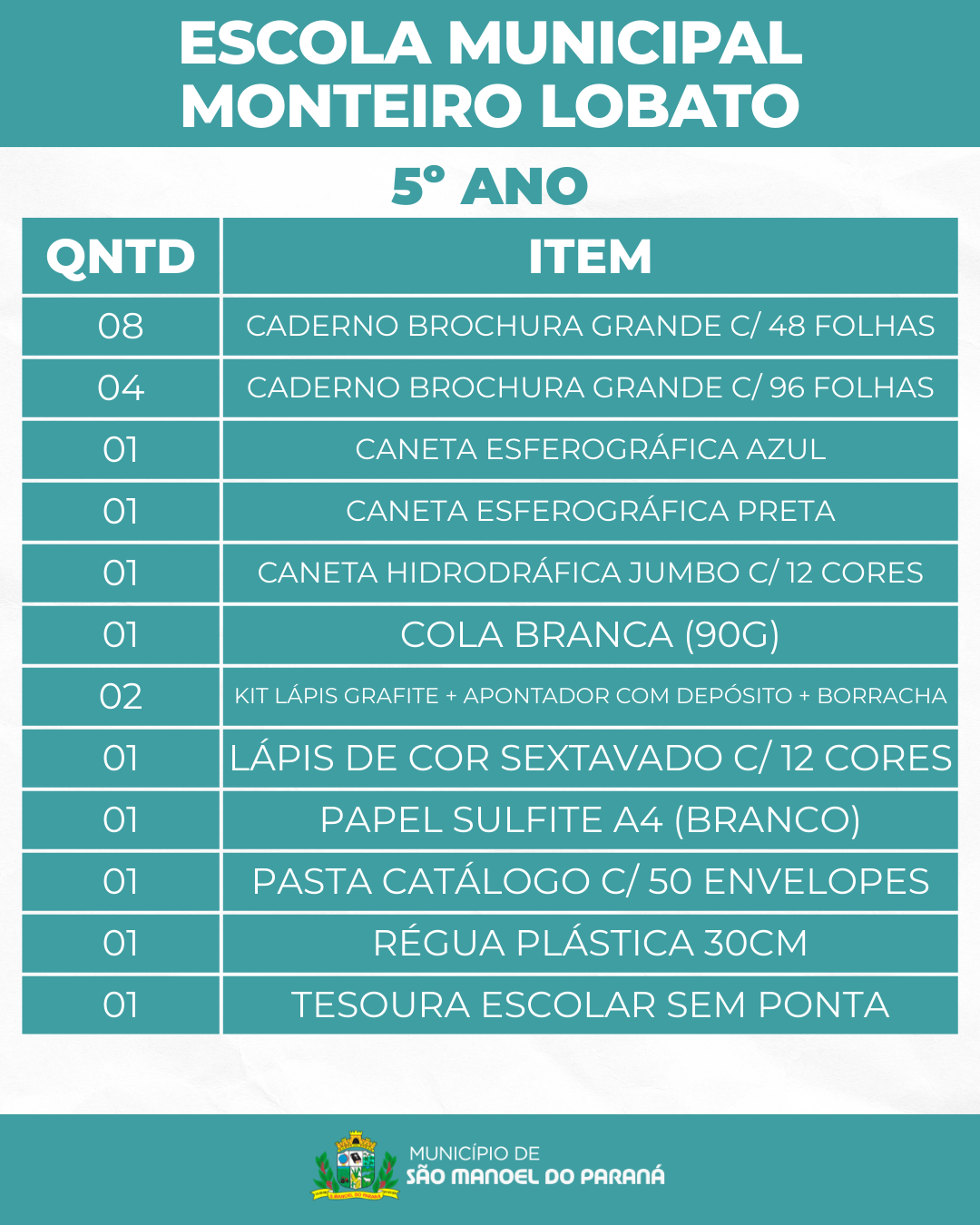 A Secretaria Municipal de Educação de São Manoel do Paraná/PR apresenta a lista de materiais escolares que serão distribuídos gratuitamente aos estudantes da rede municipal de ensino no ano letivo de 2026.