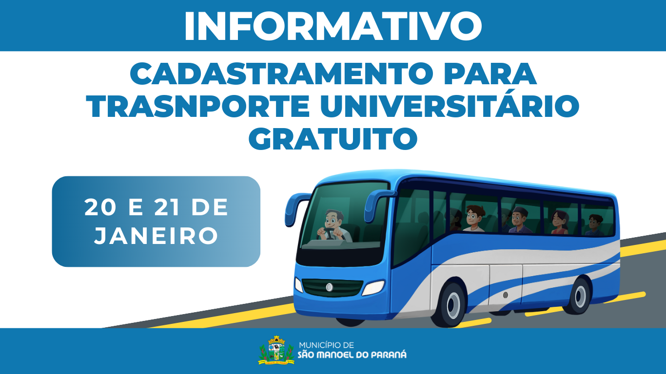 A Secretaria Municipal de Educação de São Manoel do Paraná/PR informa que o cadastramento para o Transporte Universitário gratuito, destinado aos estudantes que se deslocam para os municípios de Cianorte e Paranavaí, ocorrerá nos dias 20 e 21 de janeiro.
