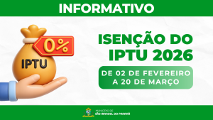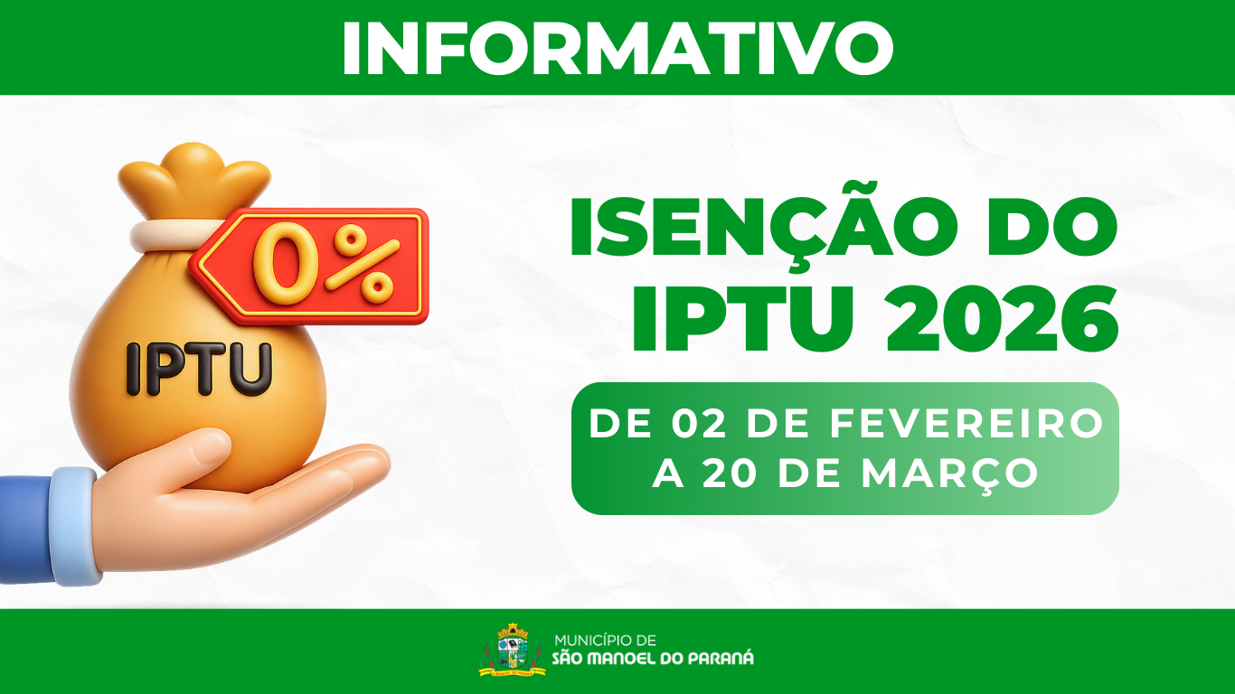 A Prefeitura Municipal de São Manoel do Paraná/PR, juntamente com a Secretaria Municipal da Fazenda e a Secretaria Municipal de Assistência Social, informa que, a partir do dia 02 de fevereiro (segunda-feira), estará aberta a solicitação de isenção do IPTU referente ao ano de 2026.