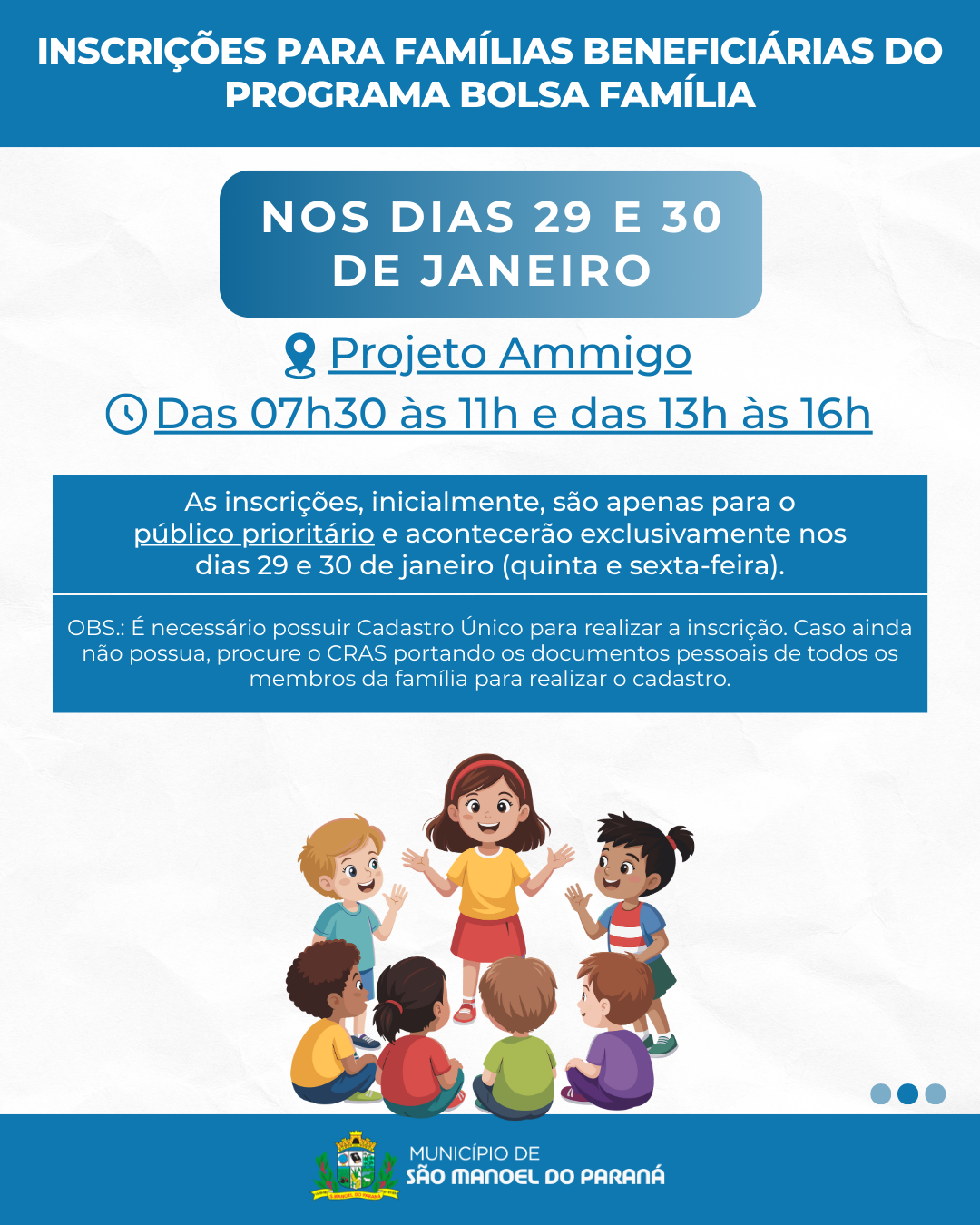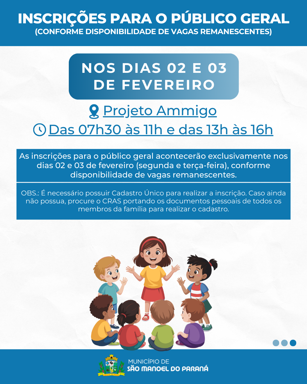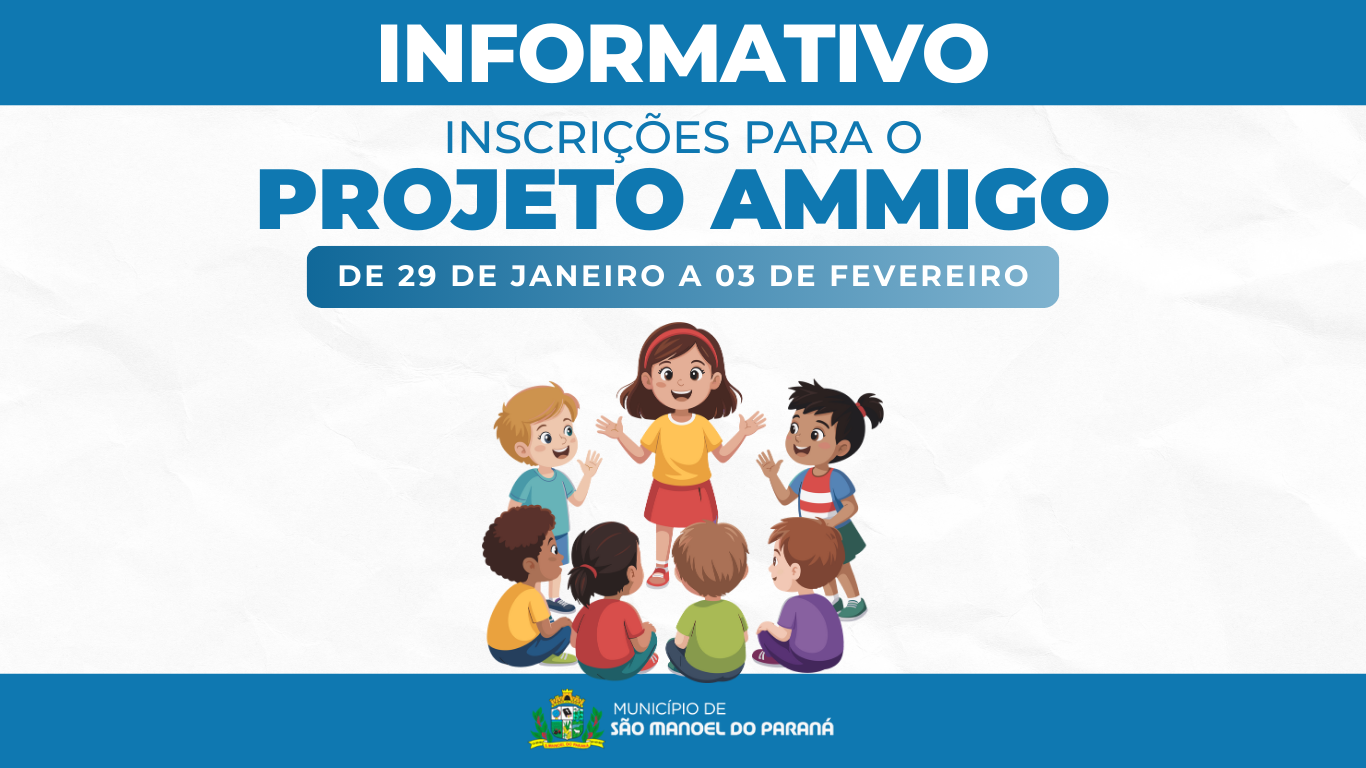 A Secretaria Municipal de Assistência Social de São Manoel do Paraná/PR informa que, do dia 29 de janeiro a 03 de fevereiro, estarão abertas as inscrições para o Projeto Ammigo, Serviço de Convivência e Fortalecimento de Vínculos, destinado a crianças matriculadas no 1º e 3º ano do Ensino Fundamental.