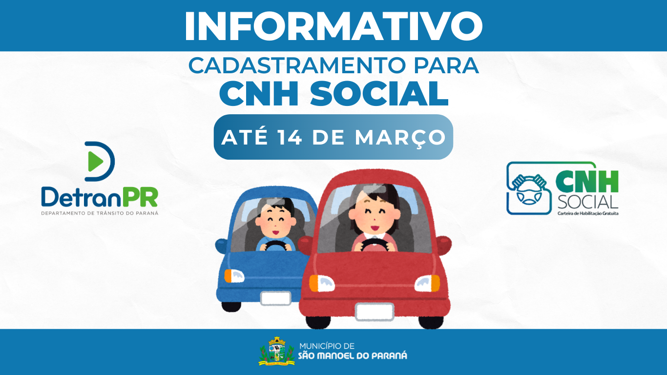 A Administração Municipal de São Manoel do Paraná/PR, por meio do Detran Municipal, informa à população que estão abertas as inscrições para o Programa CNH Social, iniciativa do Governo do Estado do Paraná que possibilita a emissão gratuita da primeira Carteira Nacional de Habilitação (CNH).