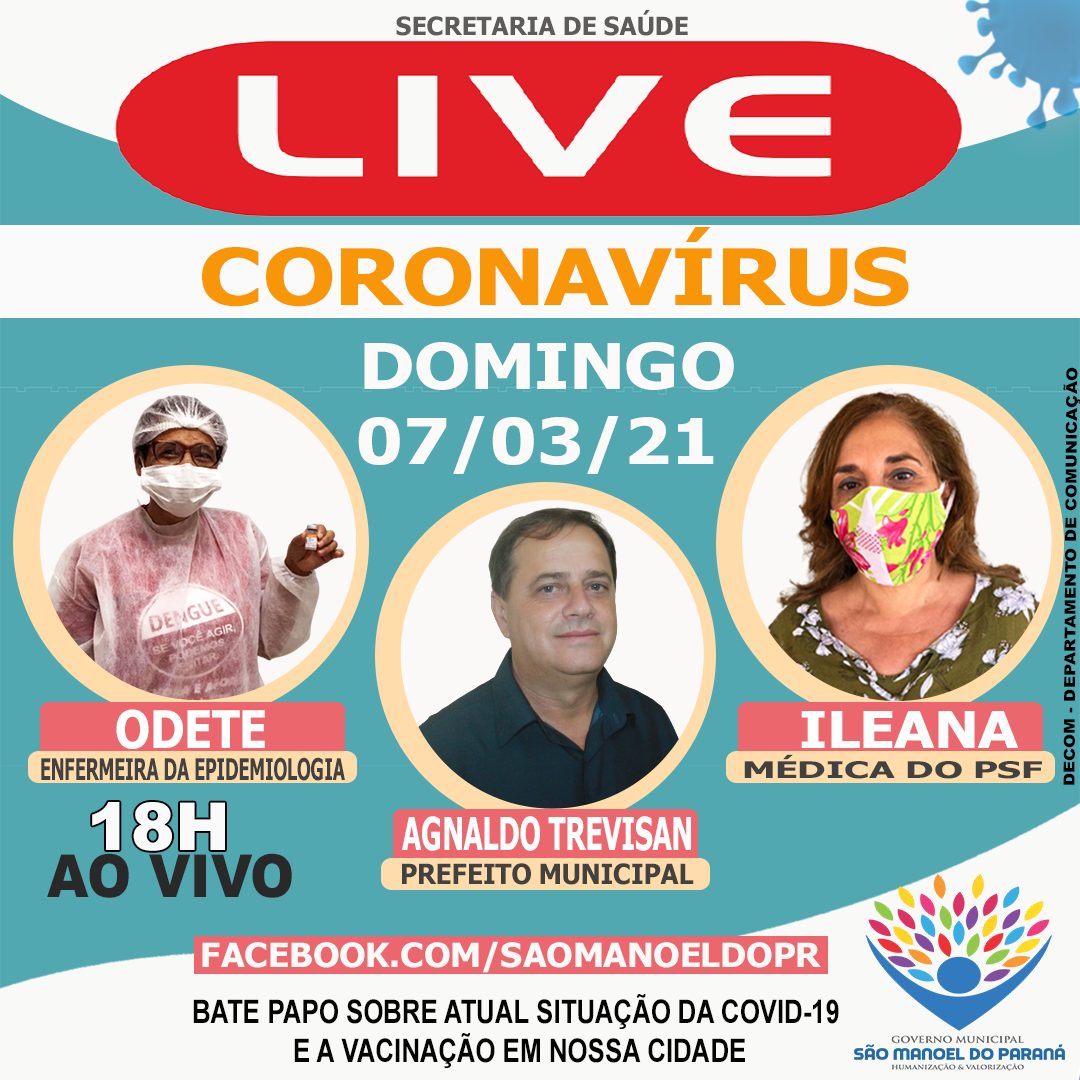 A Secretaria de Saúde de São Manoel do Paraná convida a todos para acompanhar neste Domingo dia 07/03/2021 ás 18h a Live sobre a Covid-19 em nosso município.